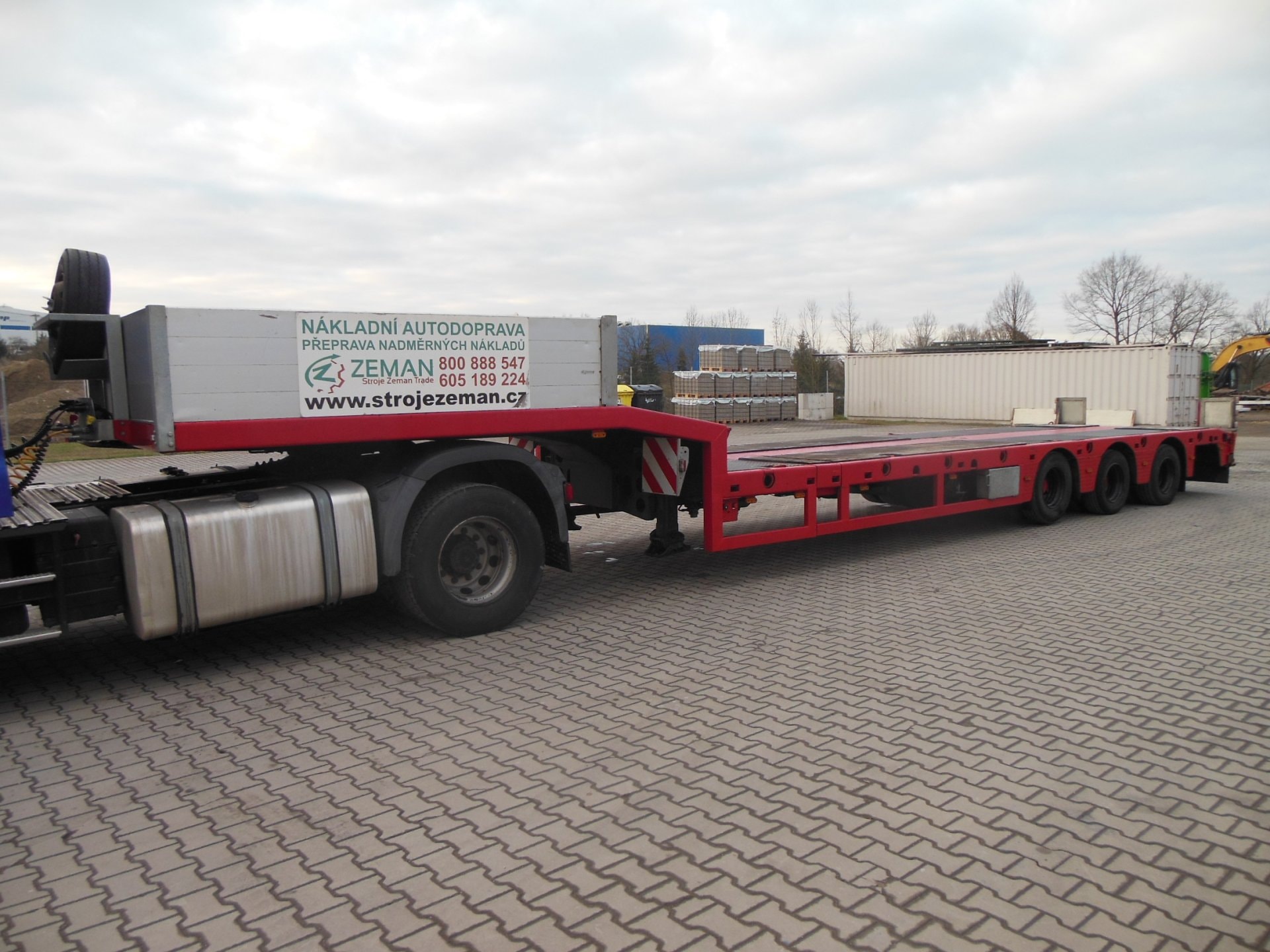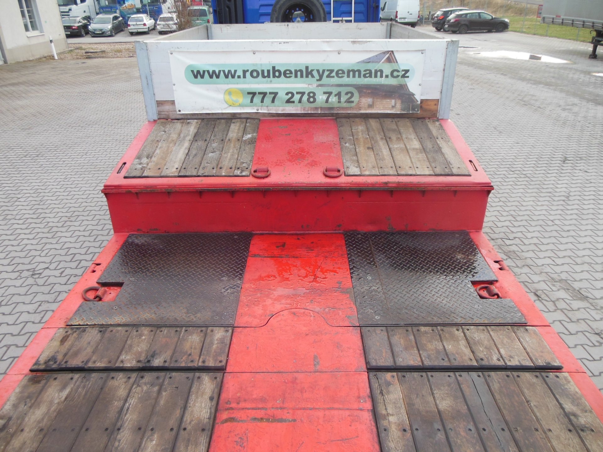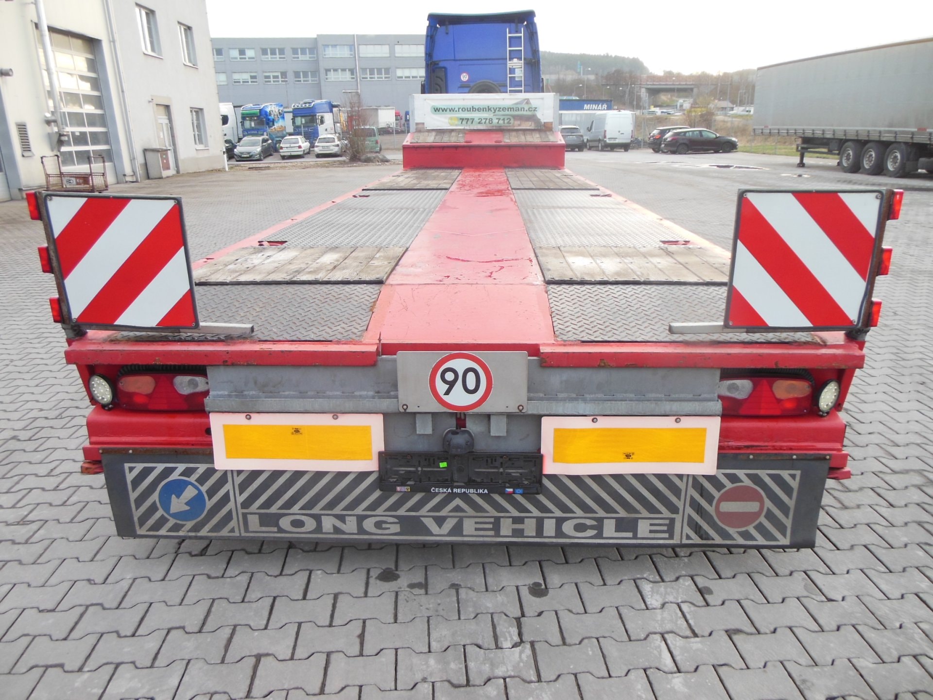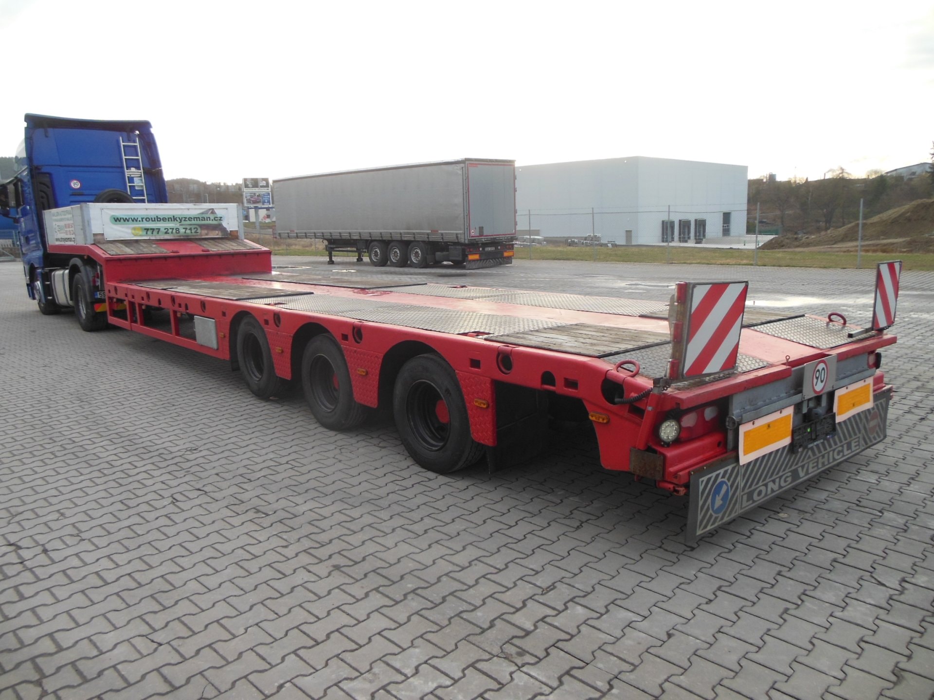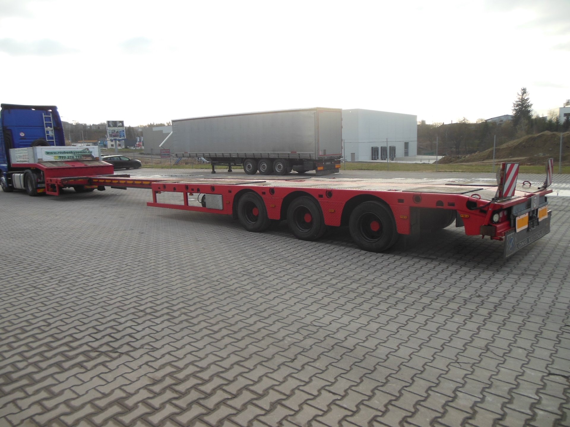 Návěs-podvalník, Kässbohrer LB3, Provoz 6/2008, zvedací náprava, nápravy Gigant, roztahovací o 6m, ložná výška 900 mm, ložná délka 9300 + 6000 mm, ložná šířka 2550 mm, ložná délka labutího krku 3900 mm, hliníkové rampy délka 2800 mm, bubnové brzdy, ABS, pneu 245/70 R17,5 stav: 1 osa 7 mm, 2 osa 8 mm, 3 osa 11 mm, rezerva, Celková hmotnost 48.000/42.000 kg, Provozní hmotnost 12.490 kg, Užitečná hmotnost 29.510 kg
