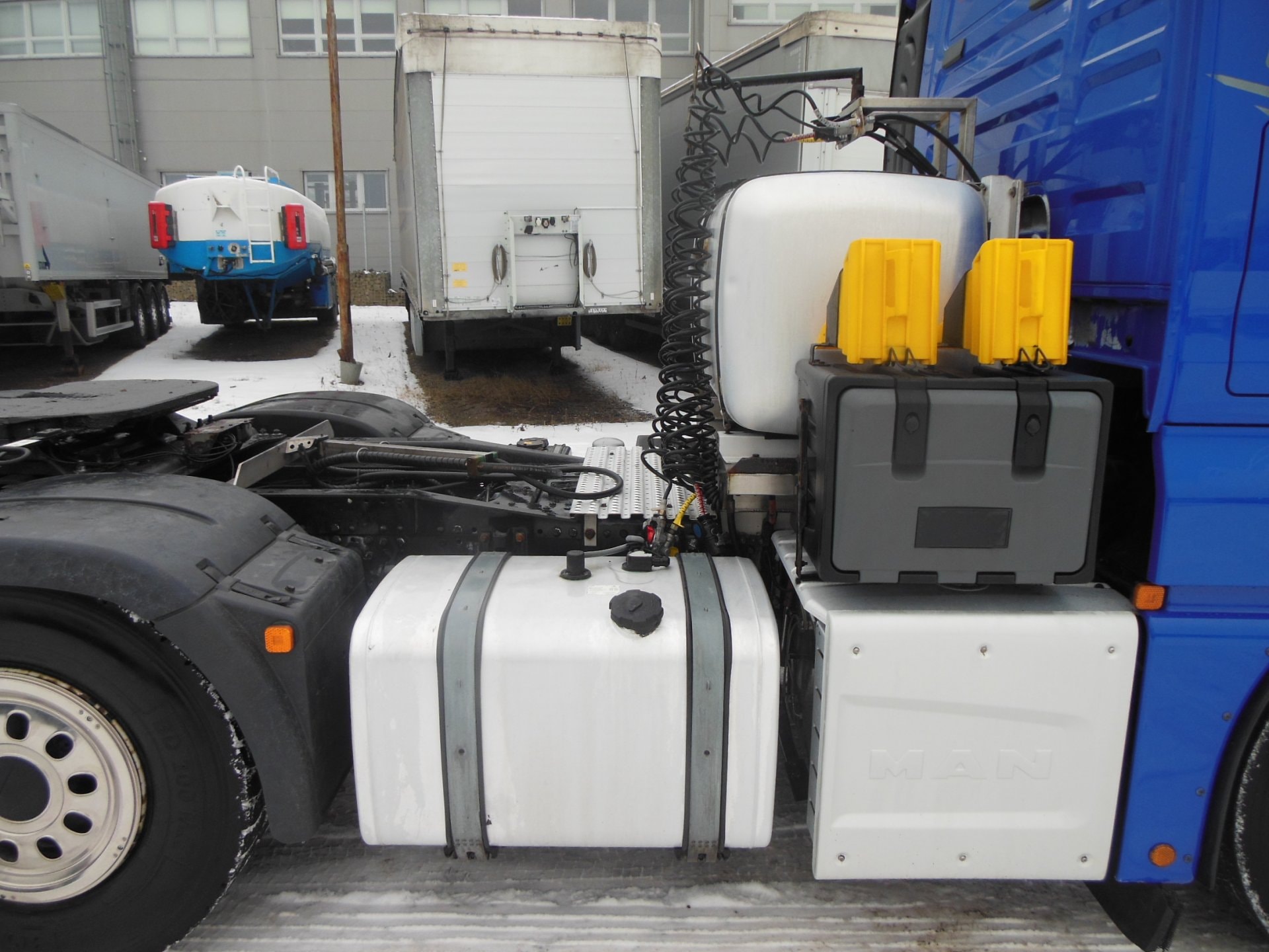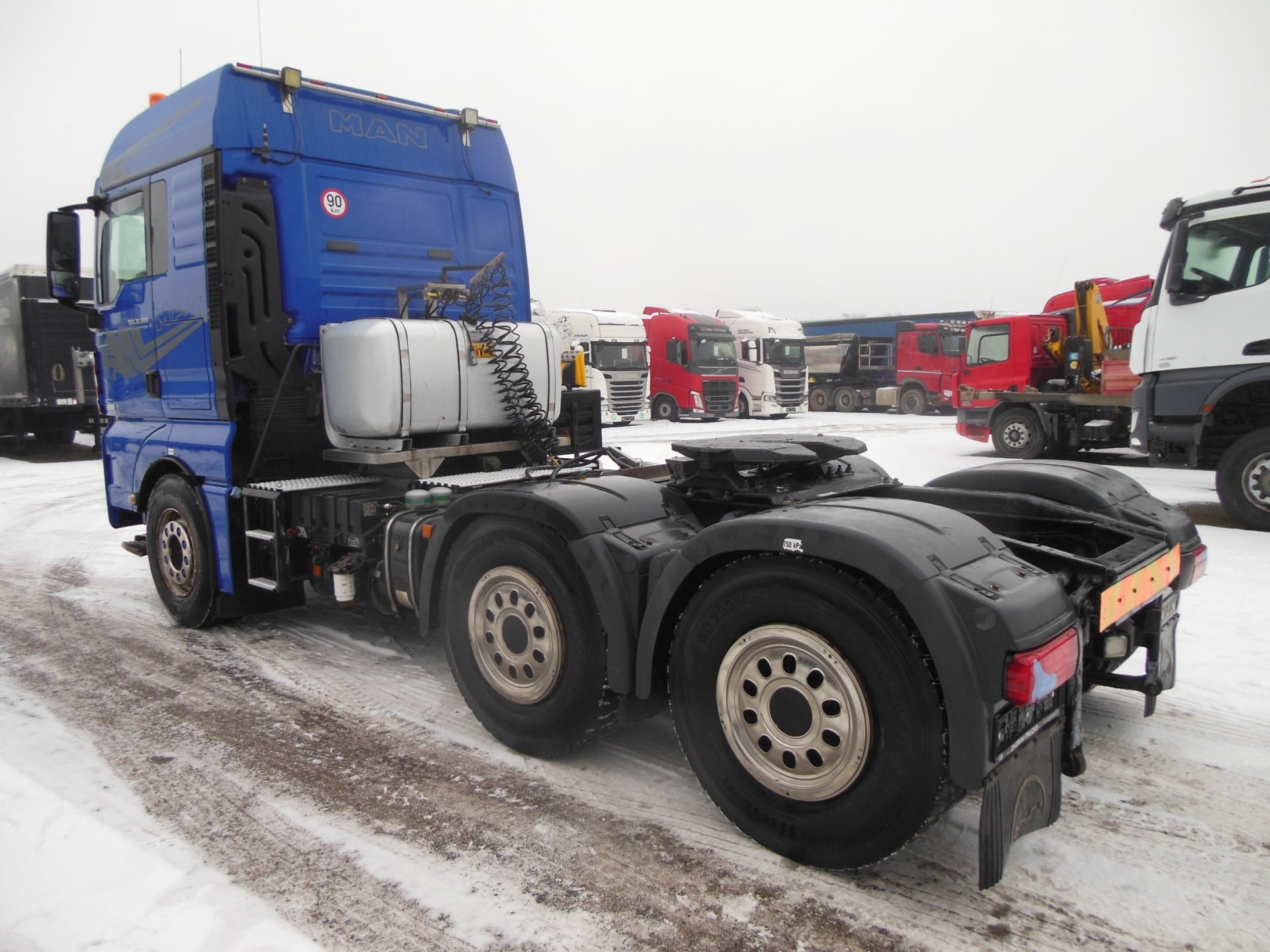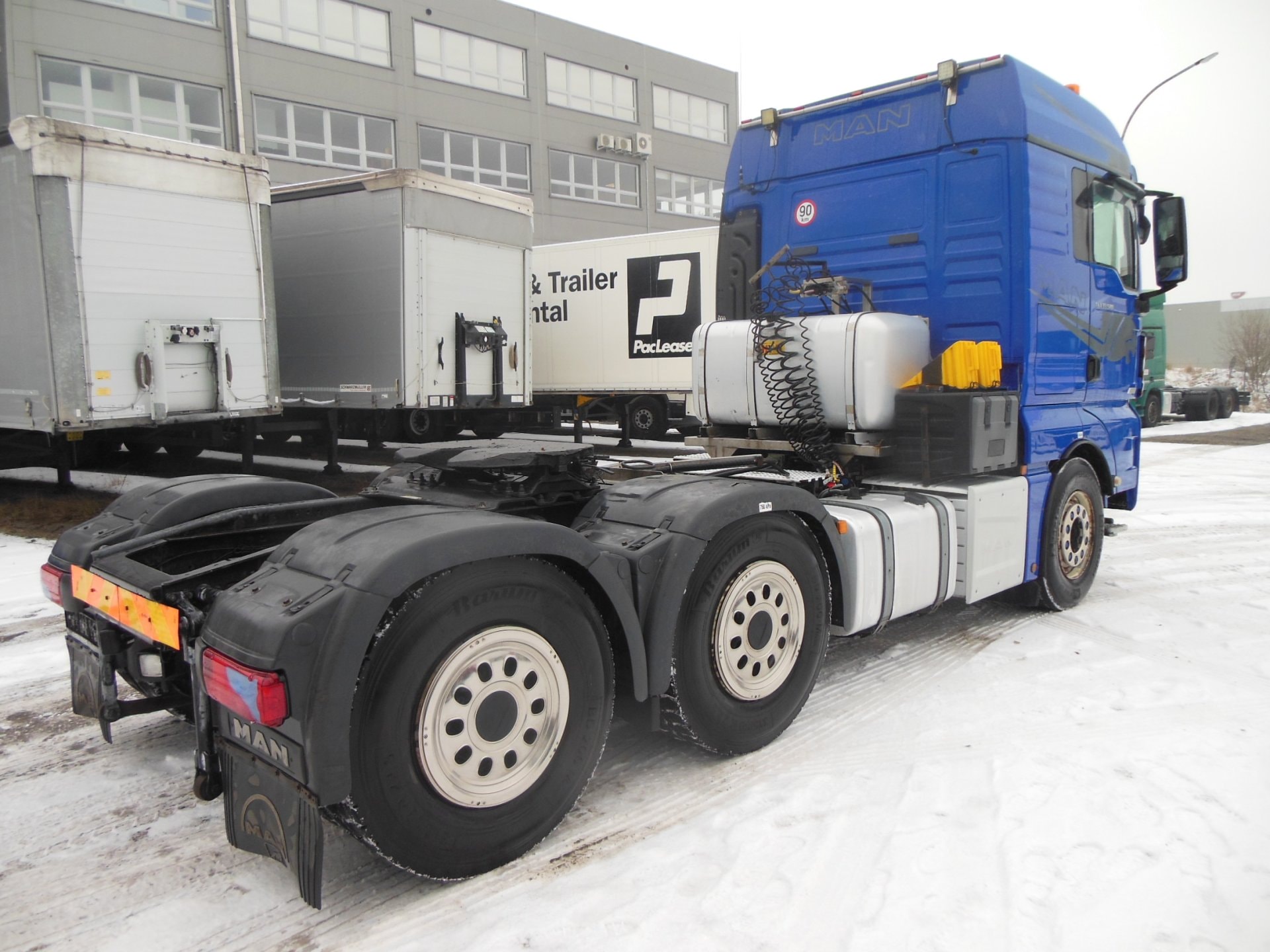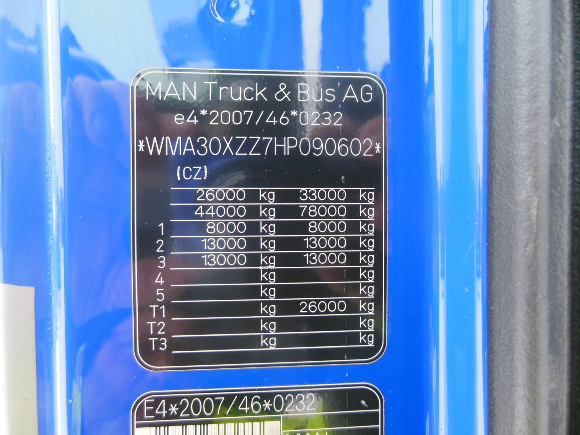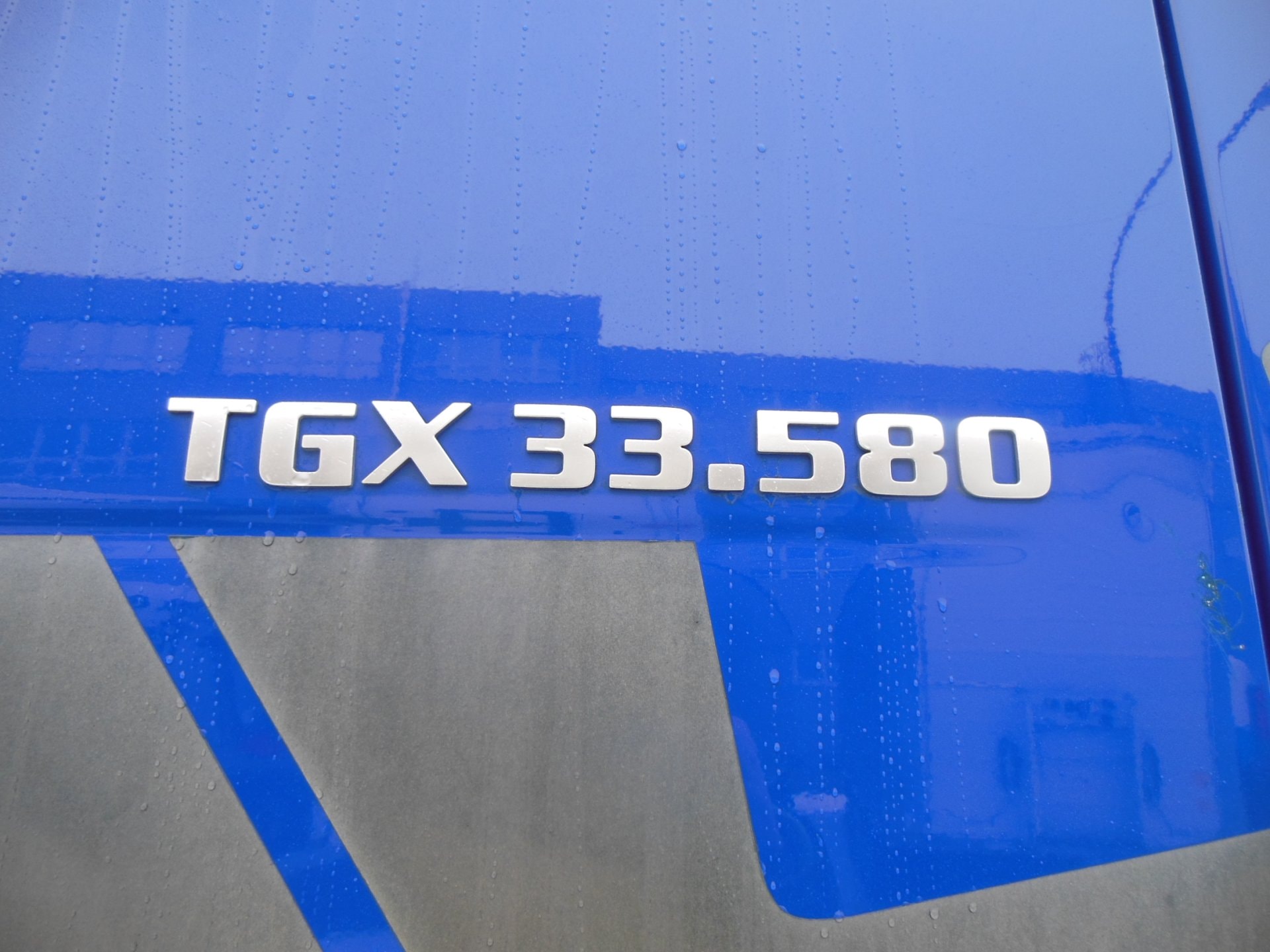 Tahač, Man TGX 33.580, SOUPRAVA 120TUN!!!, Provoz 6/2017, Najeto 435.680 km, 6x4, Retarder, Euro 6, ABS, klima, nezávislé topení, tempomat, 2 lůžka, 2 nádrže, lednička, uzávěrka diferenciálu, hydraulika, přední náprava péra, zadní nápravy měchy, pneu: 1 osa 385/65 R22,5 stav 14 mm, 2 osa 315/80 R22,5 stav 11 mm, 3 osa 315/80 R22,5 stav 10 mm, servisní knížka.