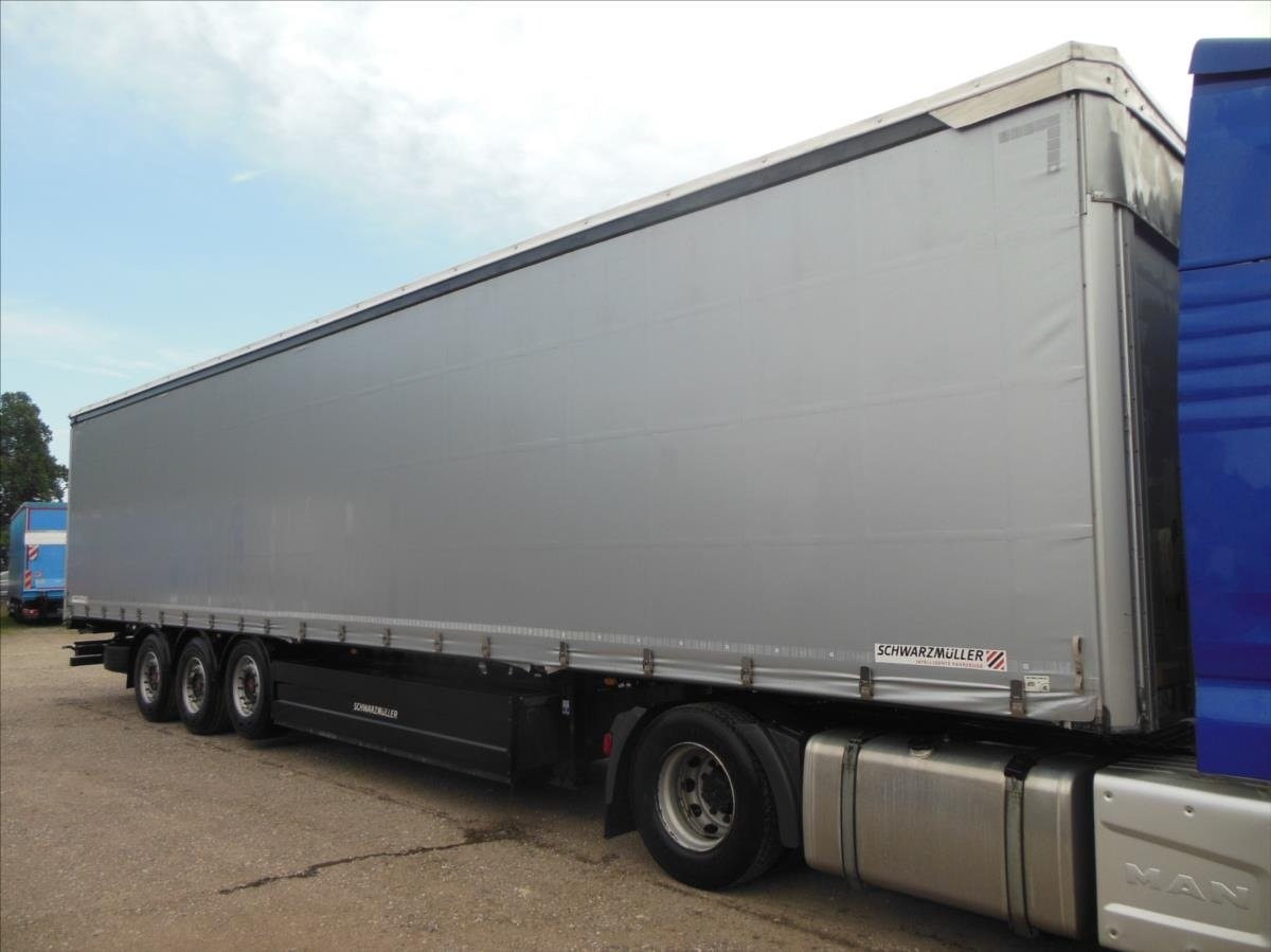 Návěs-valník, Schwarzmüller S1, BOČNICE!!!, Provoz 3/2022, zvedací náprava, náprava SAF, třístranná shrnovačka, vrata, kotoučové brzdy, ABS, pneu 385/65 R22, 5 stav: 1 osa 8 mm, 2 osa 13 mm, 3 osa 5 mm, ložná výška 2740 mm, Paletový koš, rezerva, Provozní hmotnost 6180 KG, TOP STAV!!!