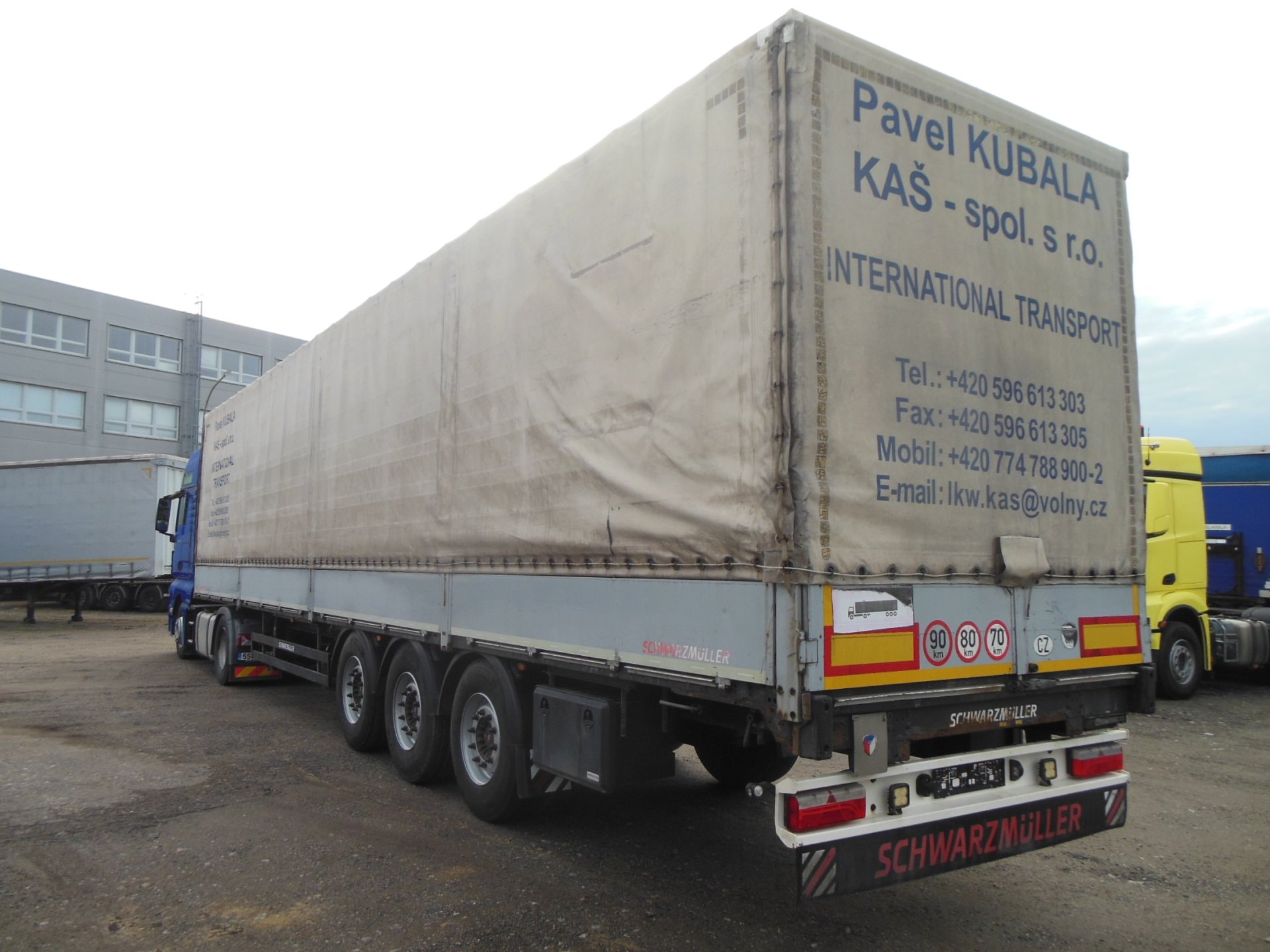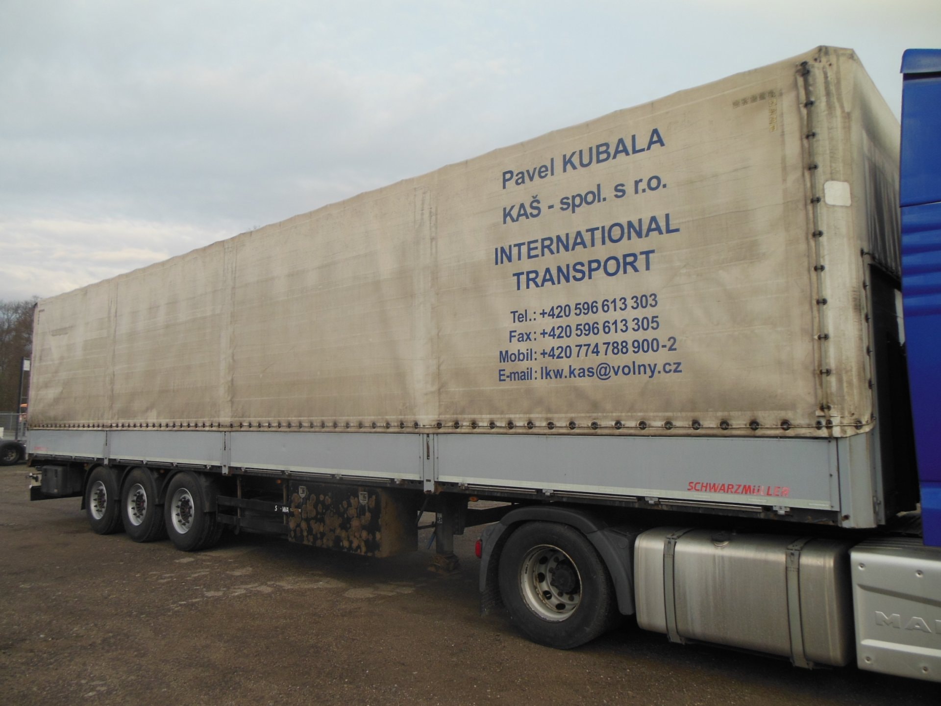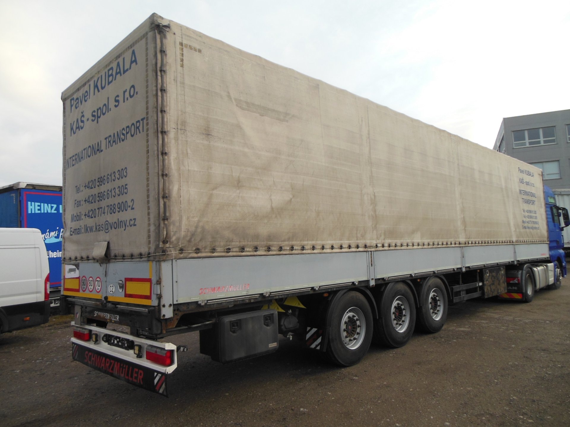 Návěs-valník, Schwarzmüller SPA 3/E, Provoz 4/2016, zvedací náprava, nápravy SAF, centrální shrnovačka, bočnice 800 mm, ABS, pneu 385/65 R22,5 stav: 1 osa 7 mm, 2 osa 17 mm, 3 osa 10 mm, rezerva, ložná výška 2760 mm, celková hmotnost 36.000 kg, Užitečná hmotnost 29.720 kg.