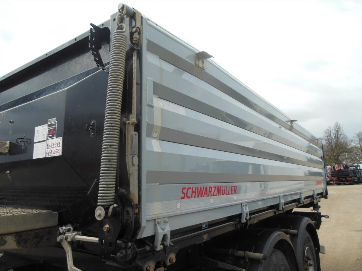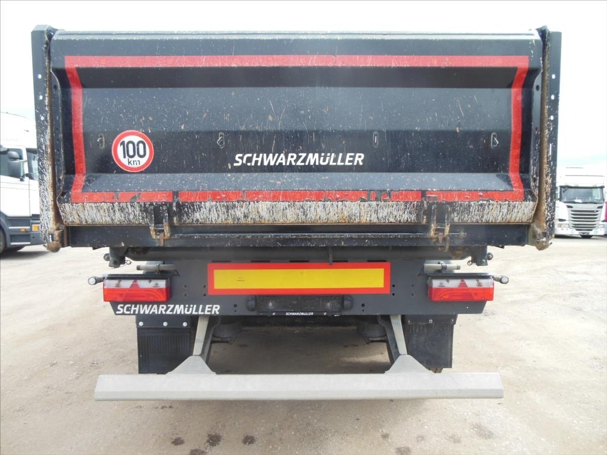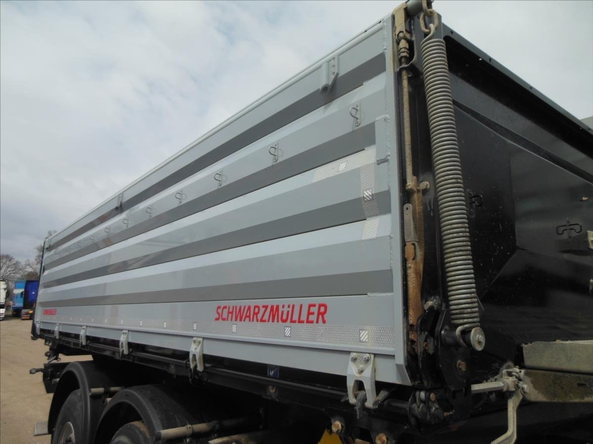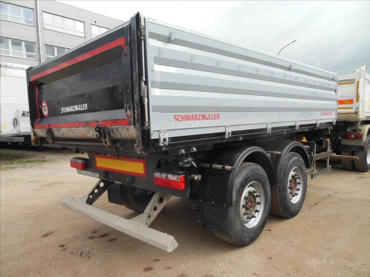Přívěs-sklápěč, Schwarzmüller TKIA 2/E, Provoz 6/2022, nápravy SAF, ložná plocha 4900x2420x980 mm, třístranný sklápěč, bočnice se otevírají dolu i nahoru, paletový rozměr, pro závěs 50 mm, kotoučové brzdy, ABS, pneu 385/65 R22,5 stav cca 13 mm, Celková hmotonost 18.000 kg, Provozní hmotnost 4150 kg.
