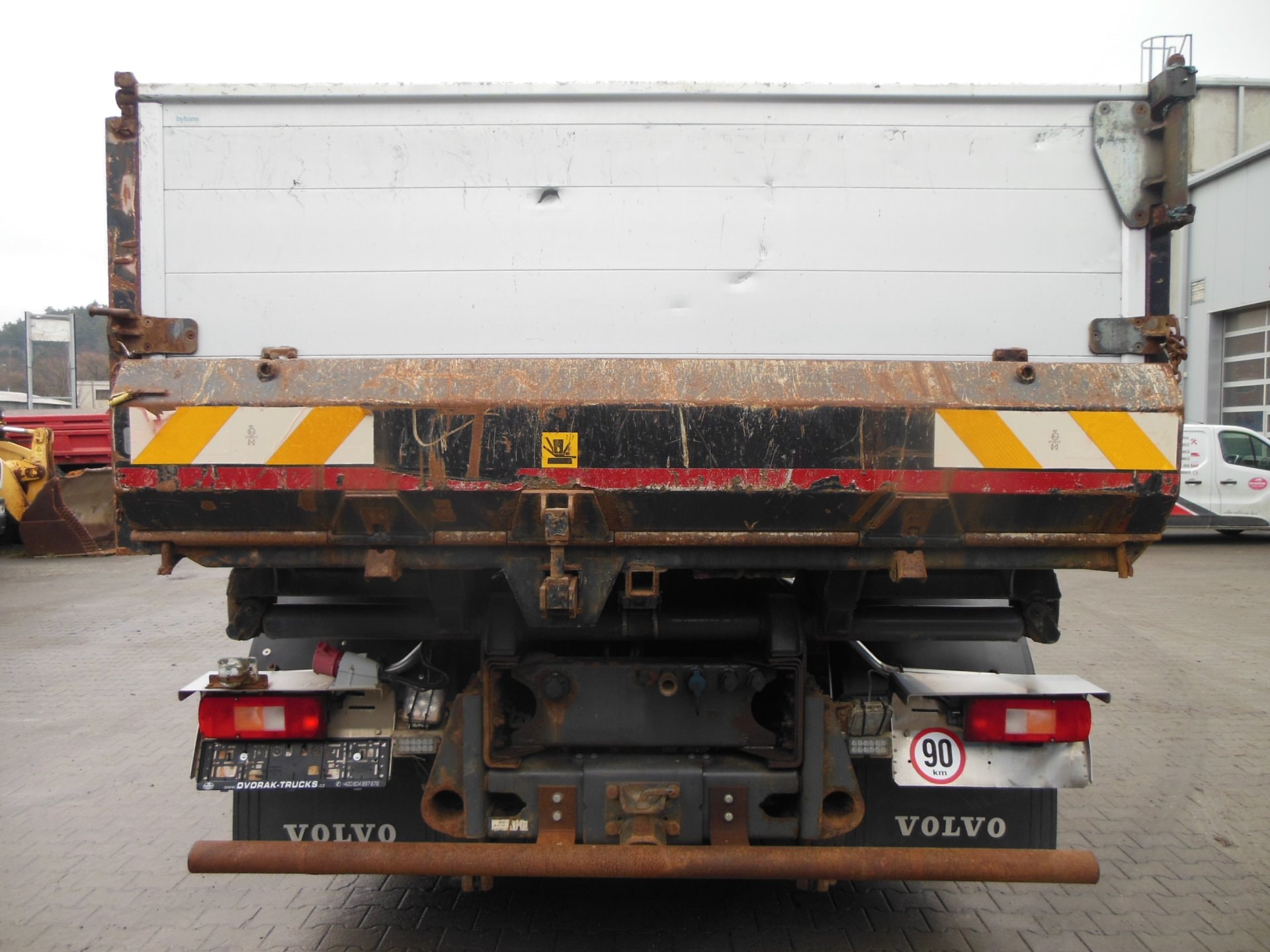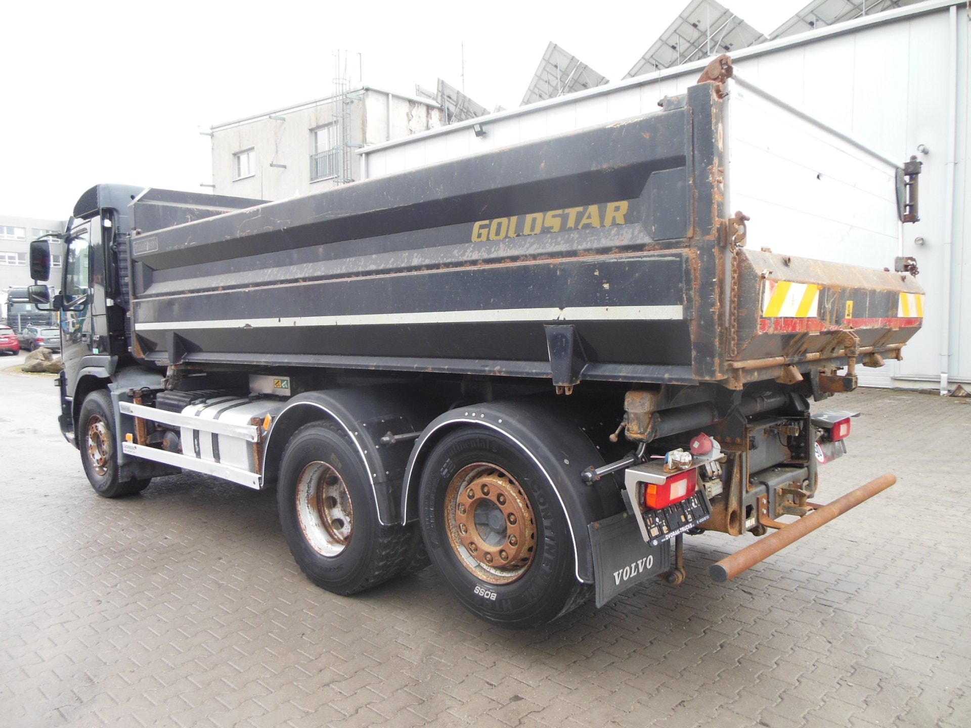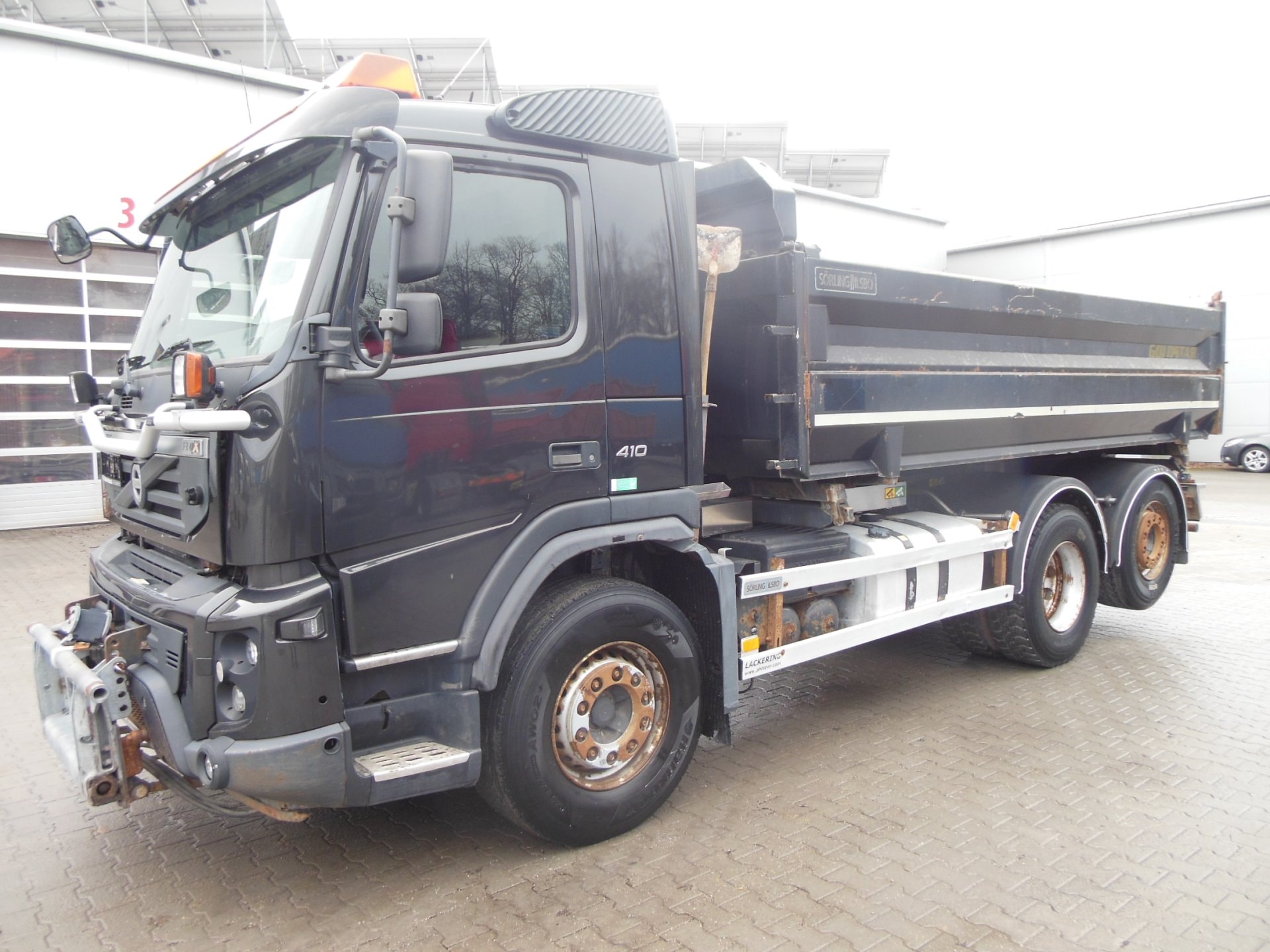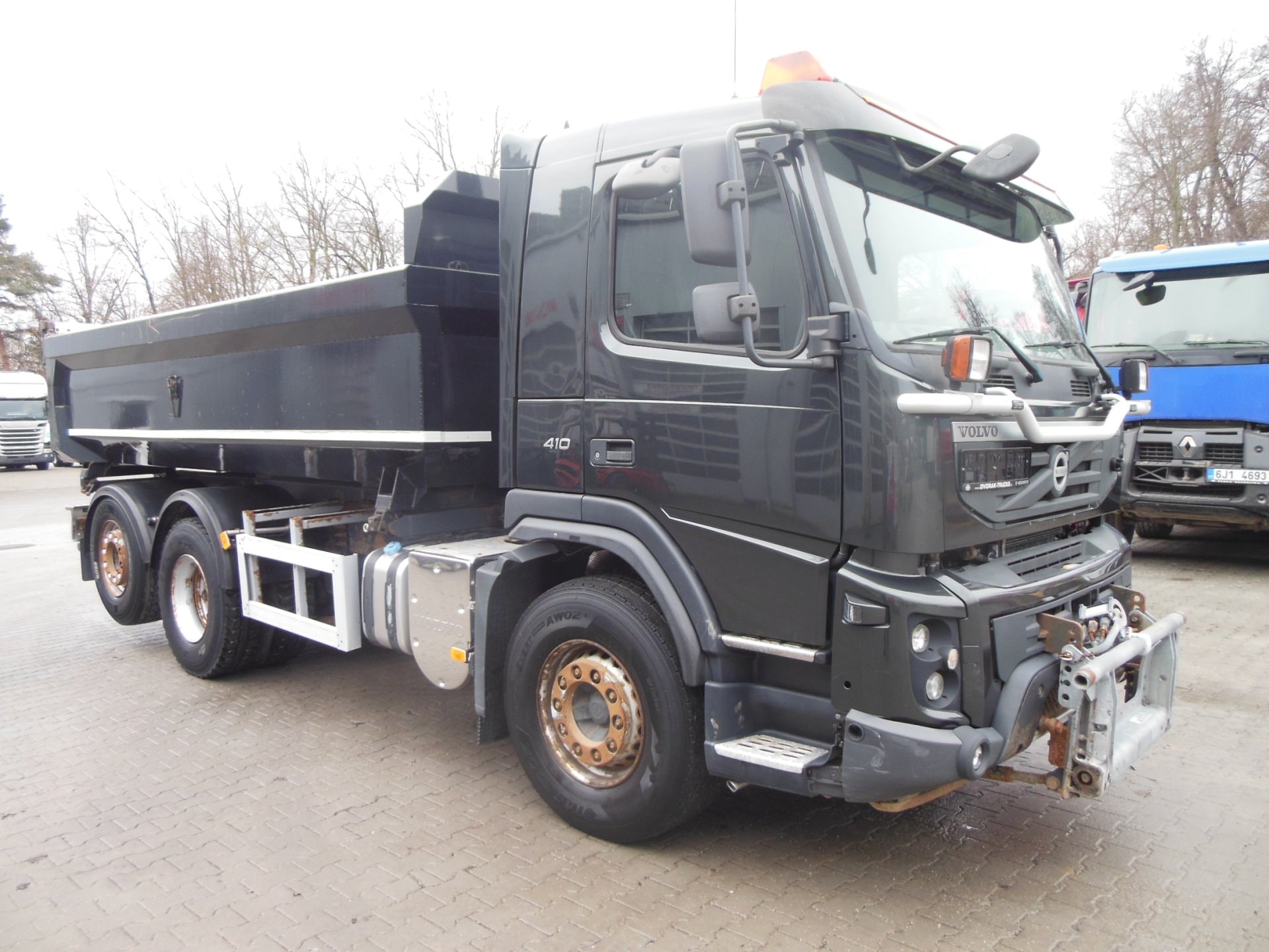 Nákladní aut-sklápěč, Volvo FMX 410, Provoz 7/2013, Najeto 354.719 km, 6x2, třetí osa zvedací + natáčecí, 410 PS, automatická převodovka, ABS, klima, nezávislé topení, tempomat, uzávěrka diferenciálu, hydraulika, sklápěč S1, nástavba Sörling, ložná plocha 5090x2400x950 mm, přední náprava péra, zadní nápravy měchy, pneu: 1 osa 385/65 R22,5 stav 10 mm, 2 osa 315/80 R22,5 stav 14 mm, 3 osa 385/65 R22,5 stav 11 mm. Provozní hmotnost 13.115 kg, Celková hmotnost 25.000 kg, Užitečná hmotnost 11.885 kg.