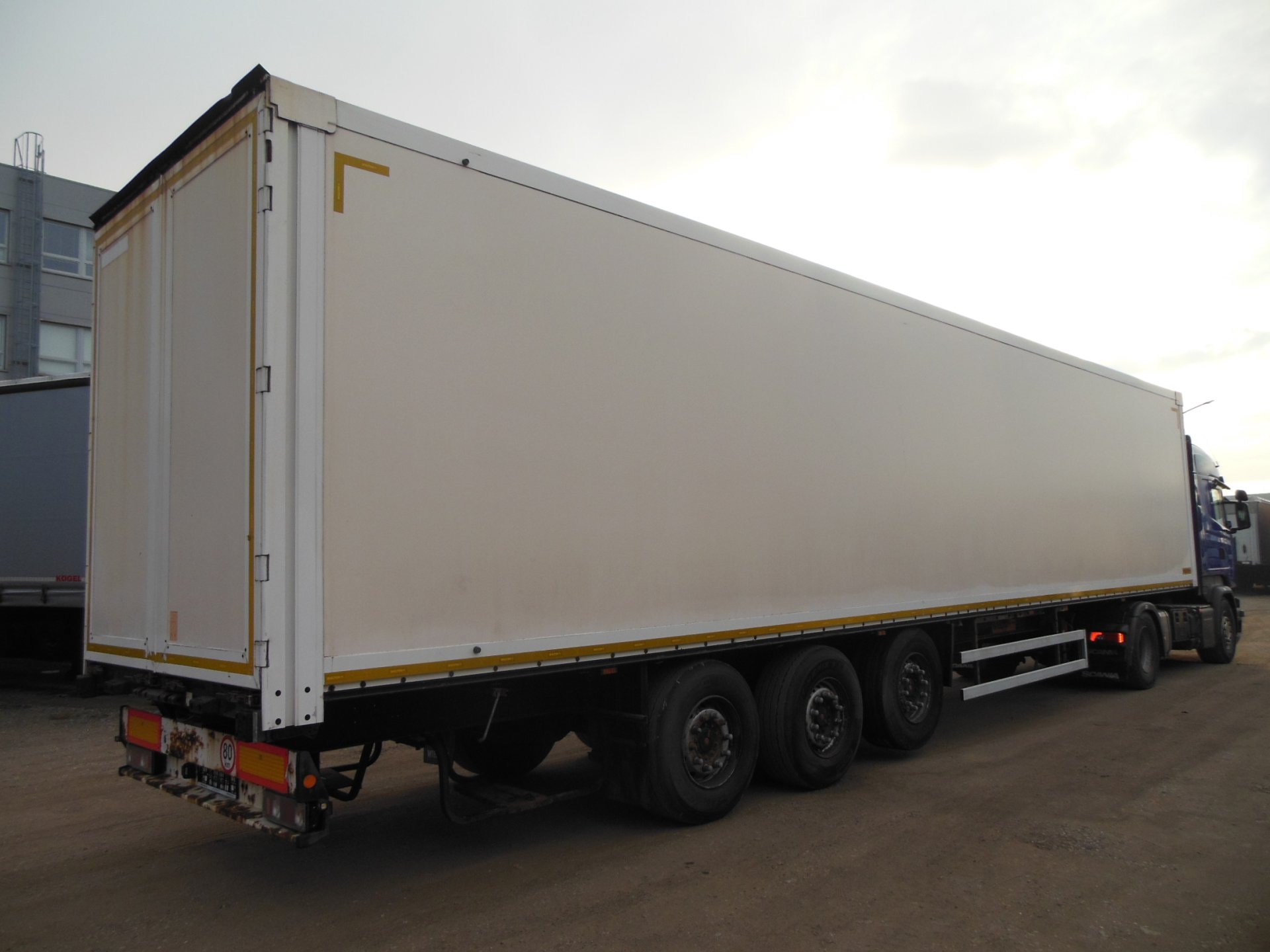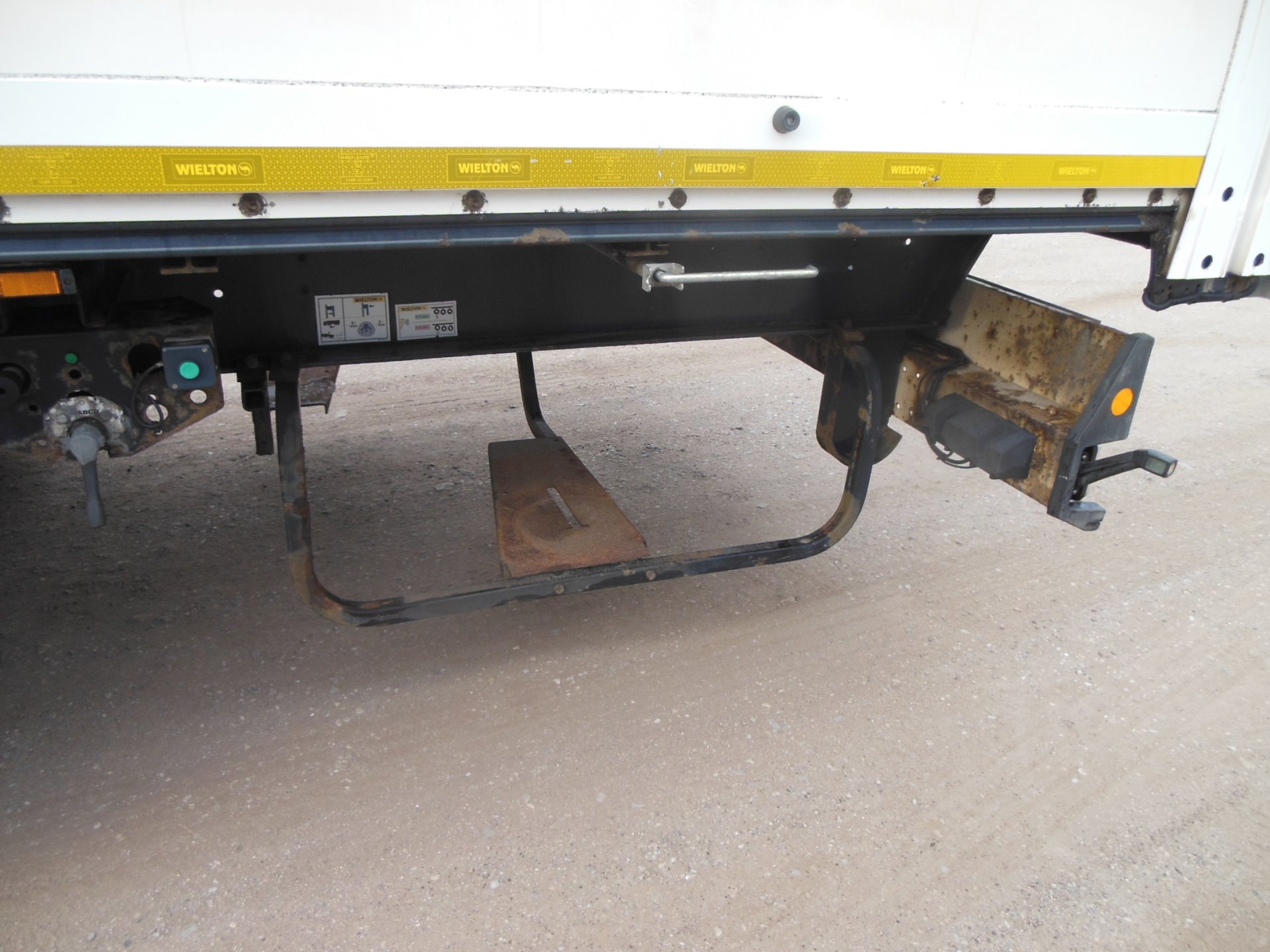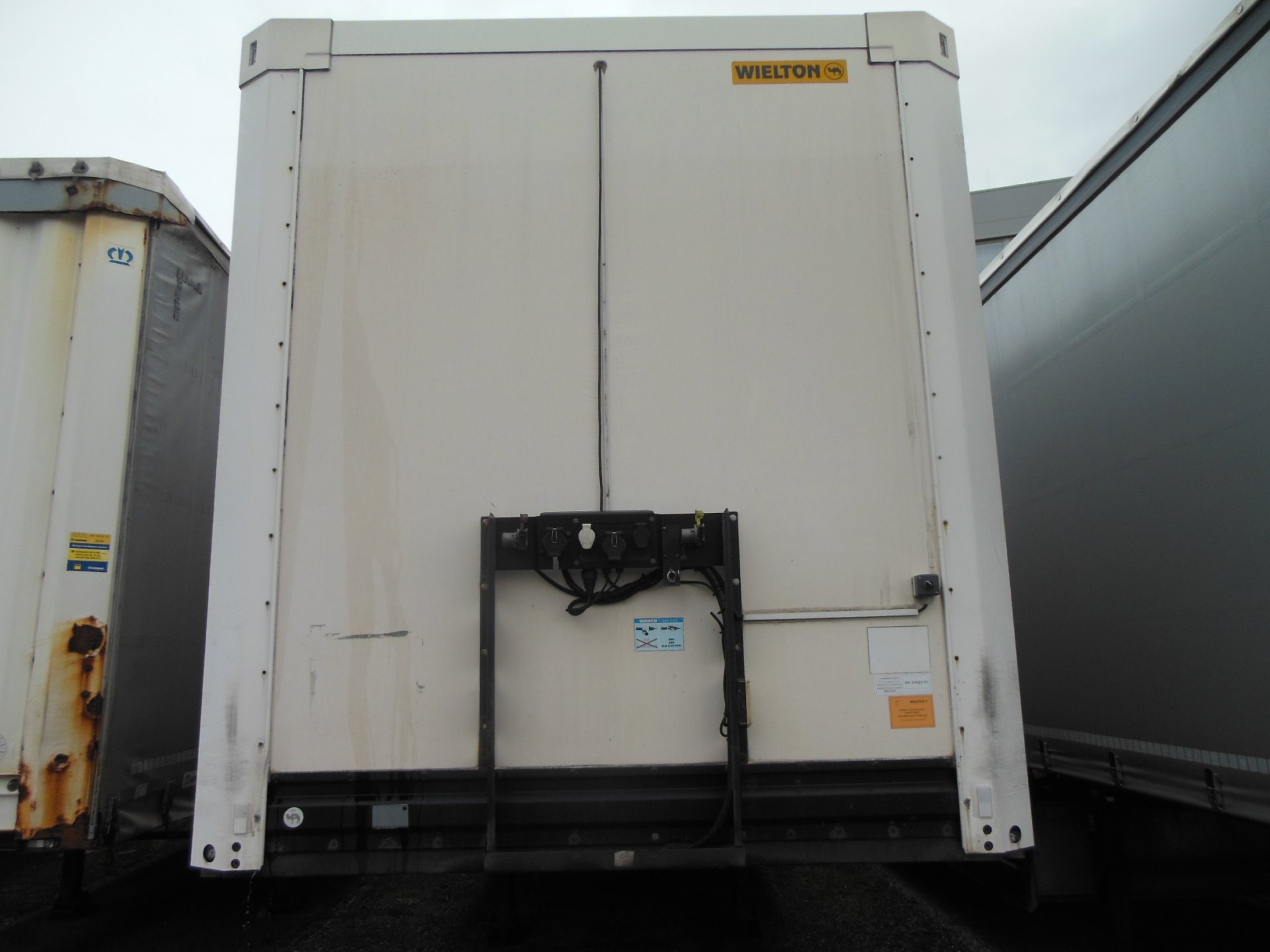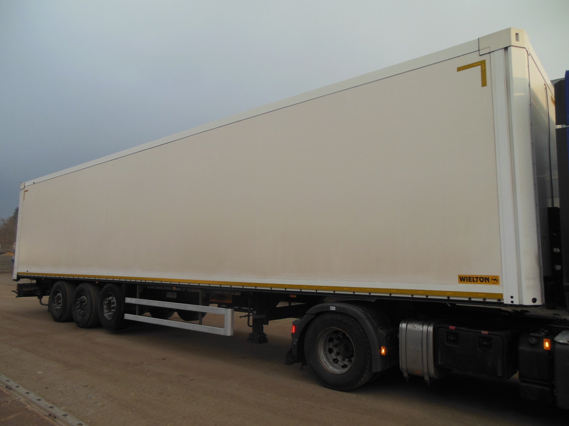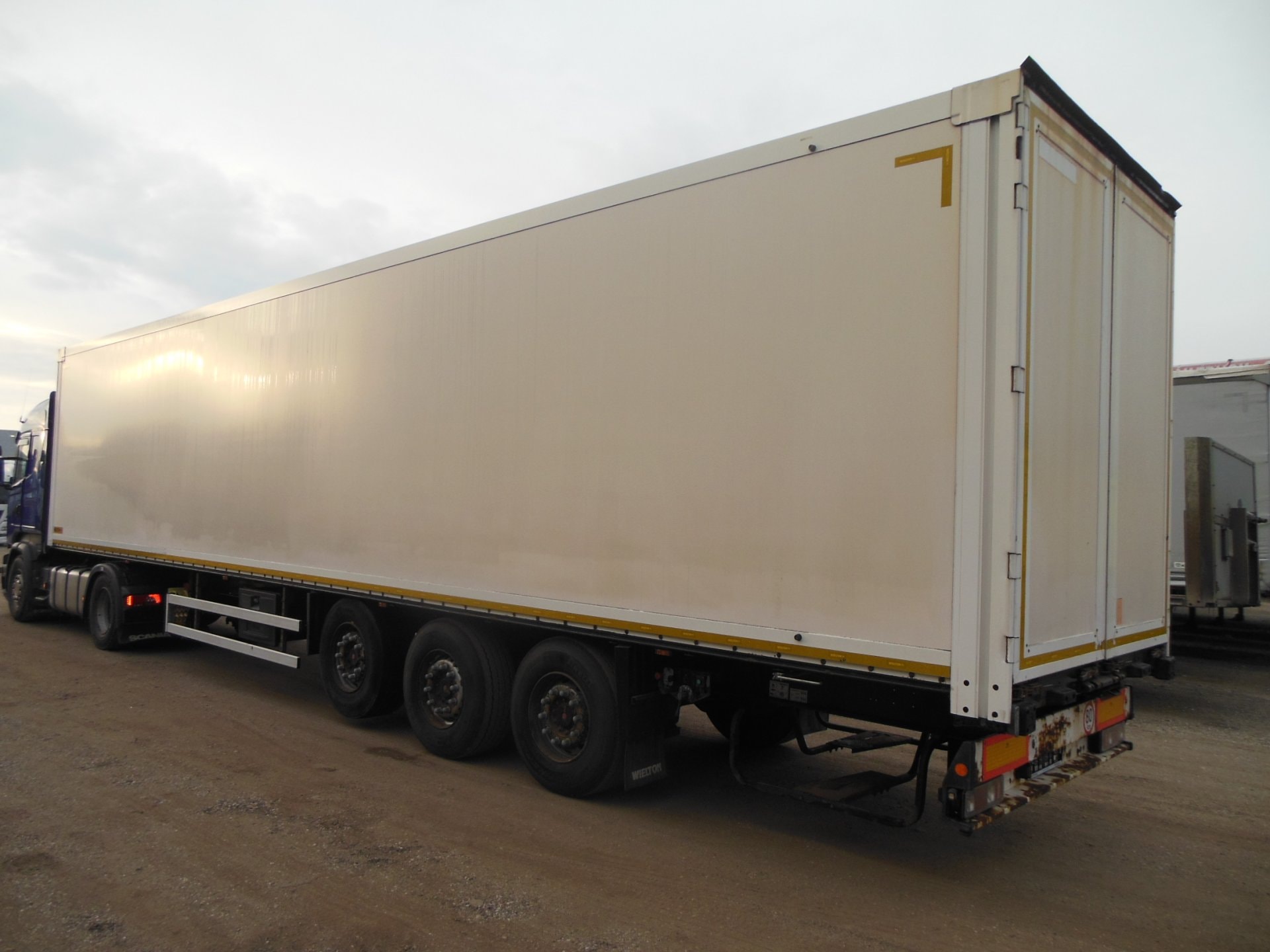 Návěs-skříň, Wielton NS-3, Provoz 4/2015, zvedací náprava, nápravy SAF, vrata, kotoučové brzdy, ABS, pneu: 385/65 R22,5 stav: 1 osa 6 mm, 2 osa 12 mm, 3 osa 9 mm, ložná plocha 13630x2485x2700 mm, Provozní hmotnost 7200 kg, Celková hmotnost 36.000 kg.